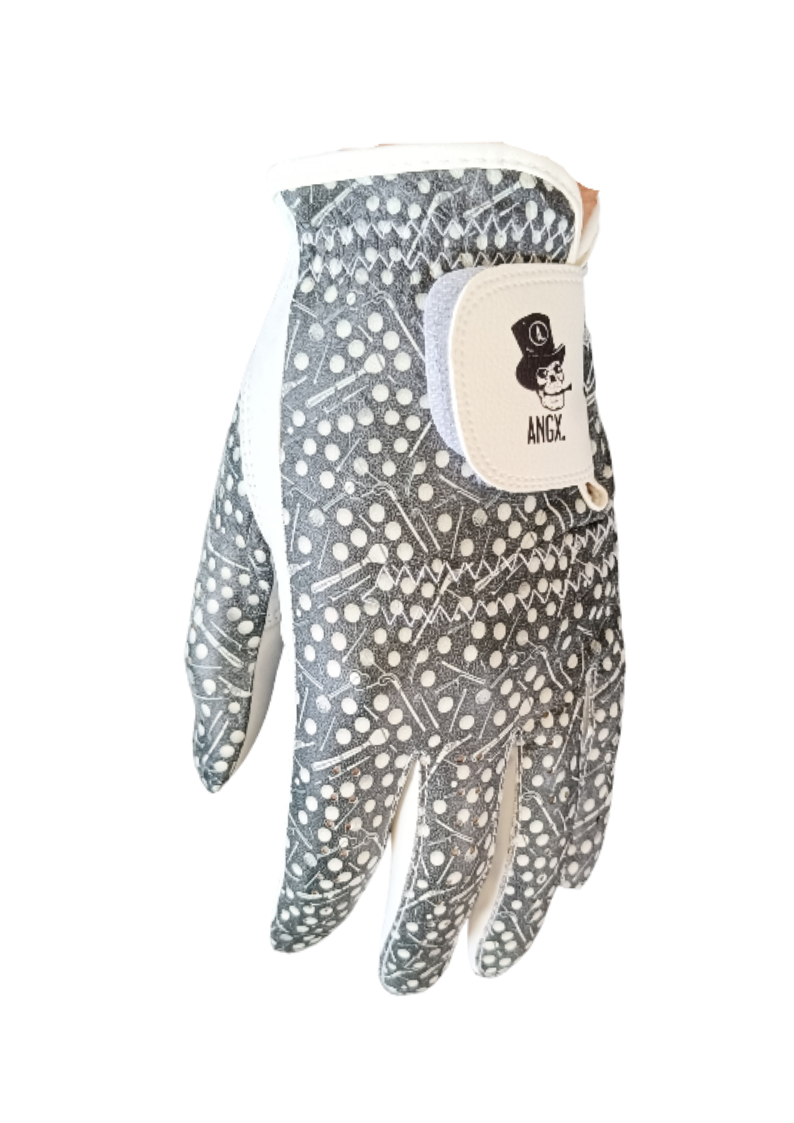 Kvalitní golfová rukavice z jemné kůže Cabretta. Bílo černá se vzorem golfových míčků a holí. S černým logem smrťáka ANGX. Velikosti od S-L. Vhodná jako unisex rukavice, která sluší jak ženám tak mužům. Dlouho vydrží a perfektně sedí. Hůl se díky této rukavici v ruce ani nehne a rukavice ani v dešti neztrvrdne. Do velkého deště zvolte raději variantu „Rain Grip“.