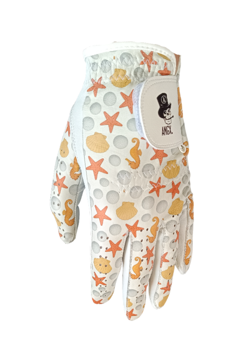 Kvalitní golfová rukavice z jemné kůže Cabretta.Motiv mořského dna, připomínájící léto na pláži. . S černým logem smrťáka ANGX. Velikosti od S-L. Vhodná jako unisex rukavice, která sluší jak ženám tak mužům. Dlouho vydrží a perfektně sedí. Hůl se díky této rukavici v ruce ani nehne a rukavice ani v dešti neztrvrdne. Do velkého deště zvolte raději variantu „Rain Grip“.