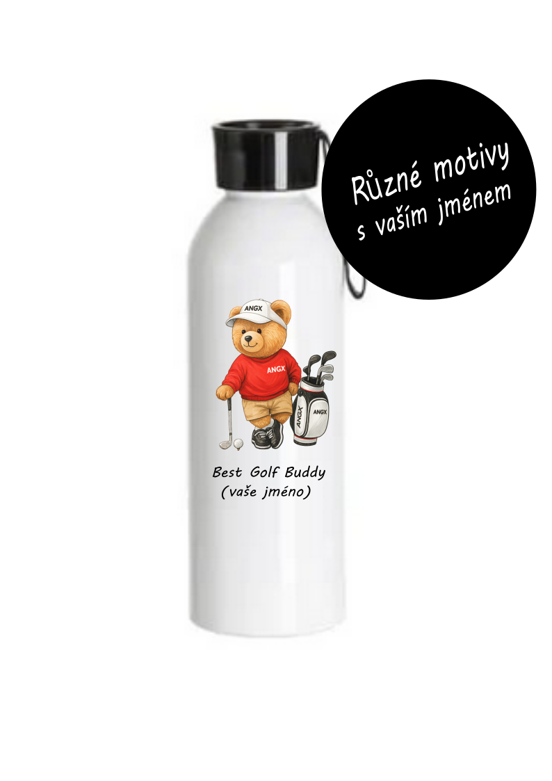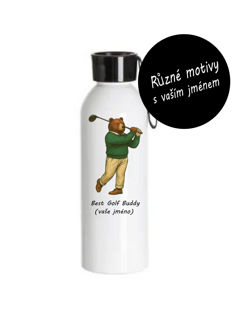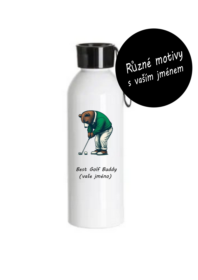 Vyberte jeden z obrázků, který vidíte na druhém obrázku v galerii. Vyberte z menu, který motiv se vám nejvíce líbí. A následně zadejte jméno, které chcete přidat. Případně nám můžete dát vědět a my změníme text ( Best golf buddy) na vámi zvolený text, na přání. Stačí vyplňit formulář v pravo. Následně u nás v dílně potiskeneme láhev přesně dle vašeho přání.
